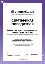 Осенью 2019 года получили сертификат победителя STARTSMILE в рейтинге частных стоматологических клиник России 2019 года.