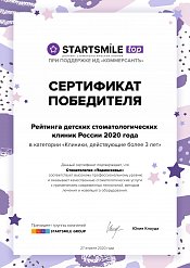 Весной 2020 года получили сертификат победителя STARTSMILE в рейтинге частных детских стоматологических клиник России 2020 года.