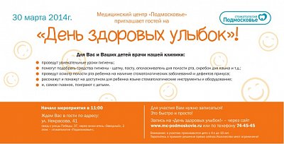 30 марта 2014 года в нашем Медицинском центре «Подмосковье» прошел «День здоровых улыбок». Это мероприятие было посвящено профилактике зубных заболеваний…