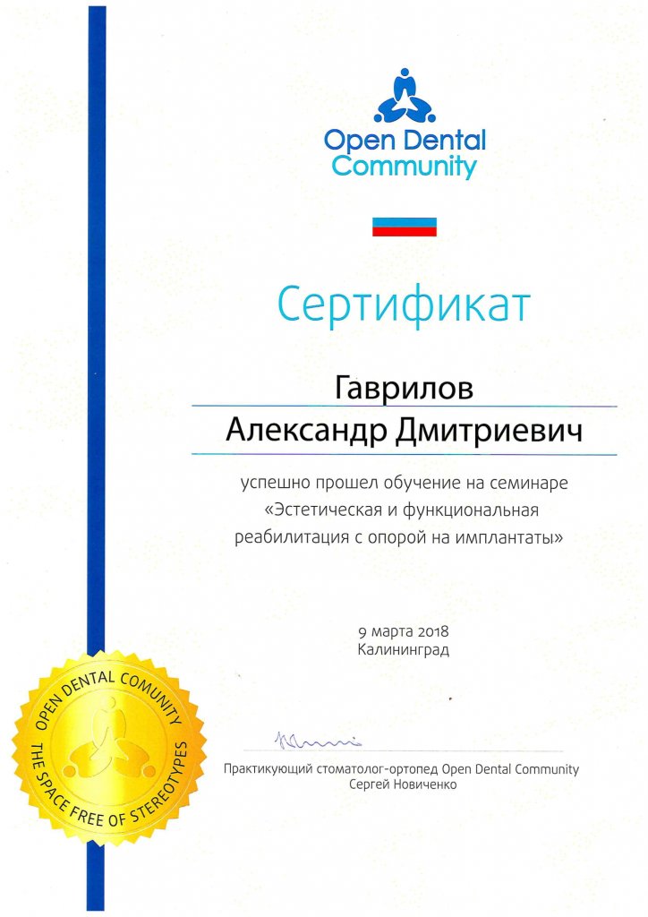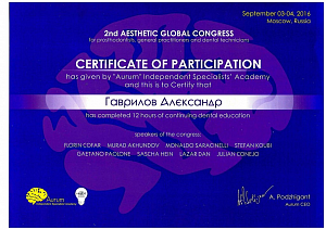 Я долго подбирала доктора-ортопеда, поскольку имела негативный опыт… читала отзывы, информацию об образовании и опыте работы. Выбор пал на Гаврилова Александра Дмитриевича. С первой минуты моего первого визита я поняла, что сделала правильный выбор. Понравилось все! Прежде всего я поняла, что со мной работает профессионал с большой буквы. Каждый шаг работы оттачивался до мелочей… доктор с помощью супер оборудования 22-го века сделал дизайн коронок, долго подбирал цвет, назначал дополнительные визиты, делал дополнительную работу по укреплению корней до начала протезирования. Создавалось ощущение, что он отдаётся этому проекту весь без остатка, вкладывая душу и сердце. И результат очень порадовал- и с эстетической точки зрения и по комфортности. Следует отметить, что последние годы я живу в Америке и несколько месяцев назад делала протезы у американского доктора, которого тоже долго подбирала. С гордостью могу заметить, что Гаврилов Александр Дмитриевич ЛУЧШИЙ!!!