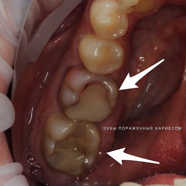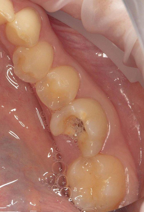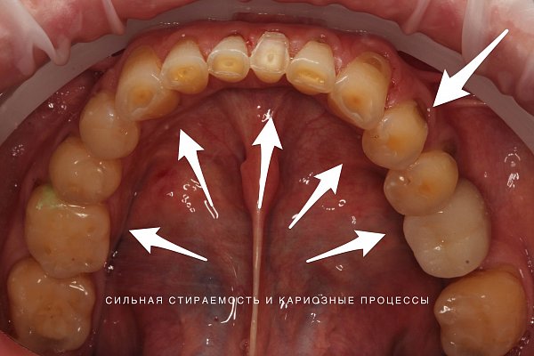 Исходная ситуация — стираемость и кариозные полости.