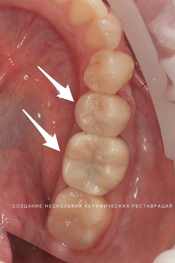 Восстановление зубов 14,15,16 с обширными пломбами и измененными в цвете, керамическими коронками