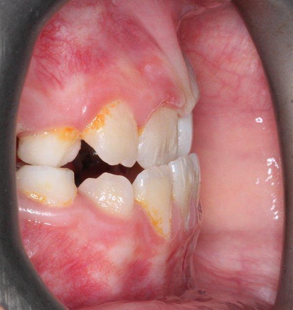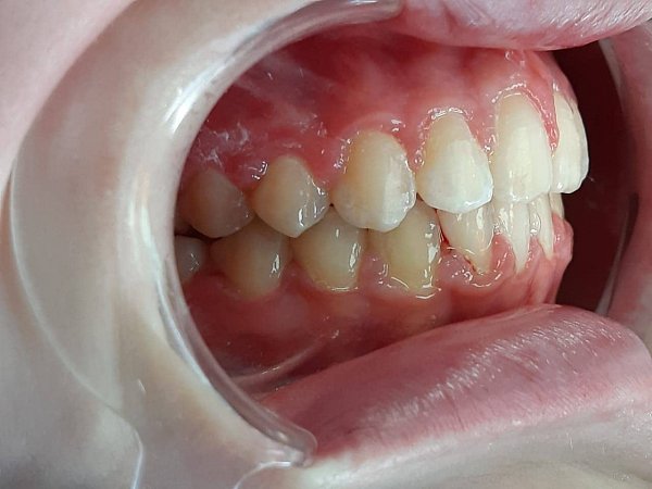 Коррекция обратного перекрытия в переднем отделе с помощью съемного пластиночного аппарата на верхнем зубном ряду.