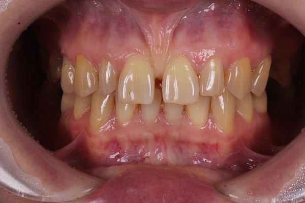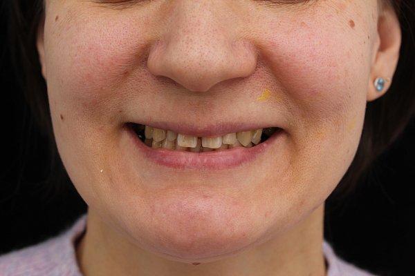 Жалоба на скол фронтальных зубов верхней челюсти, на многочисленные кариозные процессы и потемневшие реставрации.