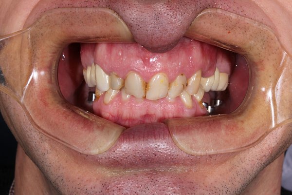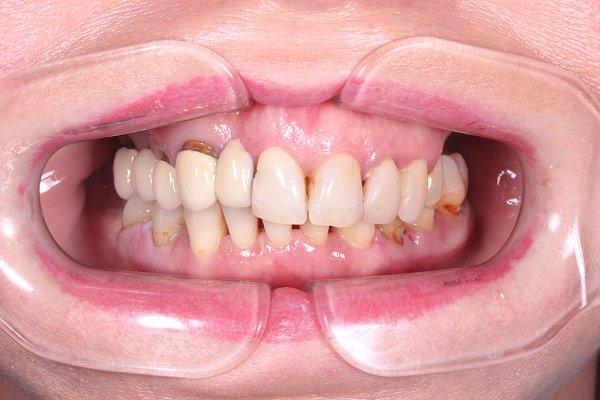 Пациент 60 лет. Жалоба на скол фронтальных зубов верхней челюсти, на многочисленные кариозные процессы и потемневшие реставрации.