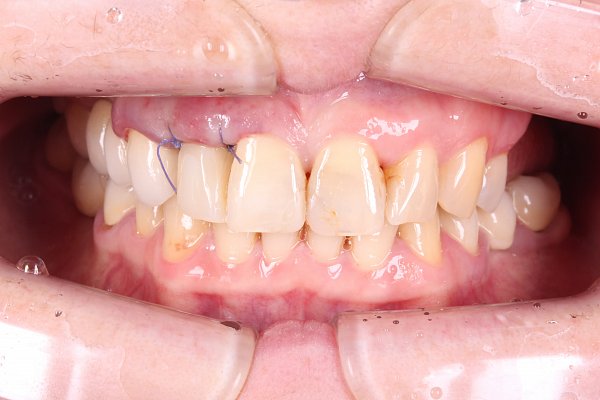 Исходно состояние: Дисколорирующие керамические виниры изготовленные в сторонней клинике. Воспалённая десна.