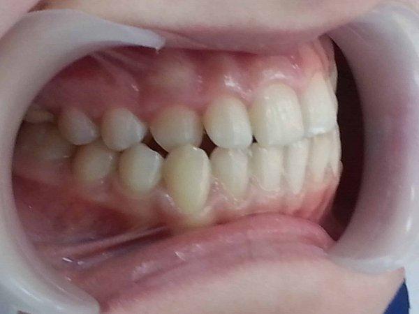 Объективно: обратная резцовая окклюзия, вестибулярное положение зуба 2.3(клык) отсутствие зуба 1.2 (первичная адентия), сужение верхней челюсти, перекрёстная окклюзия справа, из анамнеза ротовое дыхание и аденоиды.