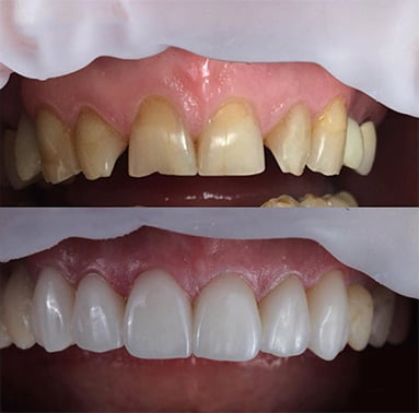 Исходно состояние: дисгармоничные коронки на центральных резцах, скол медиального угла режущего края латерального резца справа, дискалорирующие композитные реставрации на клыках и боковом резце слева.