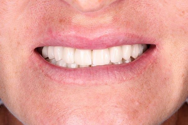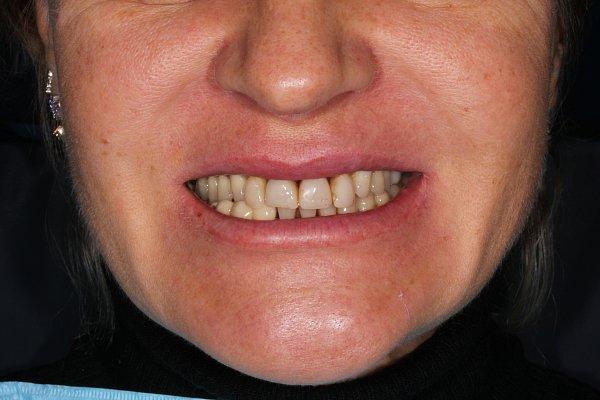 Пациентка 46 лет. Обратилась с жалобами на недостаточную эстетику старых металлокерамических коронок в области зубов 1.1 и 2.1, неудовлетворенность своей улыбкой.