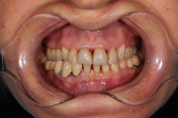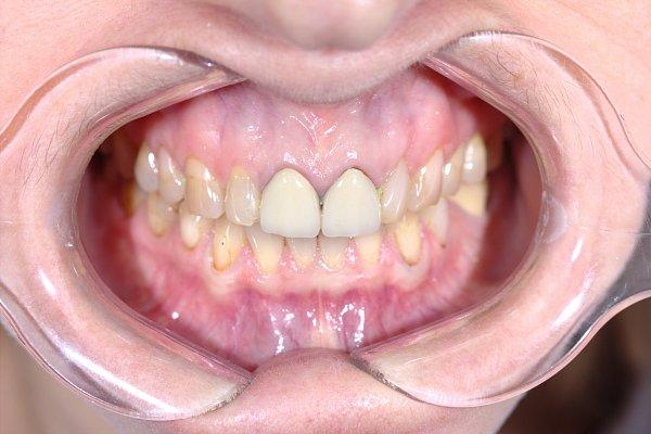 Исходно состояние: Дисколорирующие керамические виниры изготовленные в сторонней клинике. Воспалённая десна.
